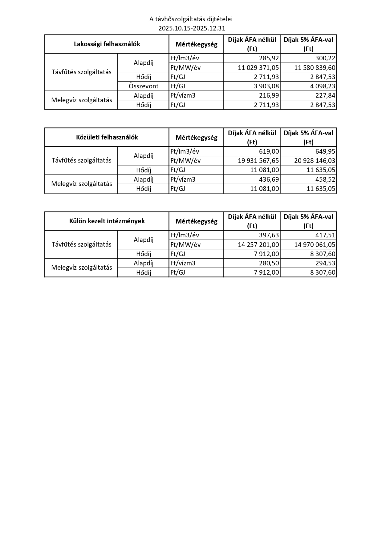 A távhőszolgáltatás díjtételei 2025.10.15-2025.12.31-ig