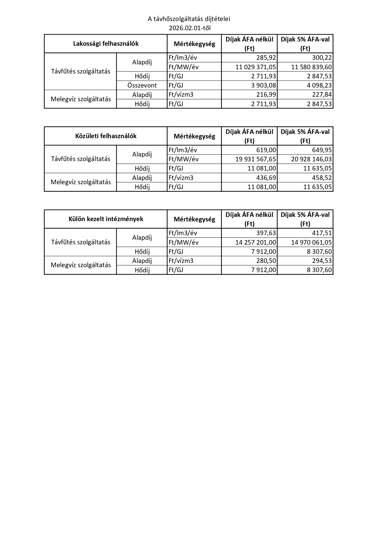 A távhőszolgáltatás díjtételei 2026.02.01-től