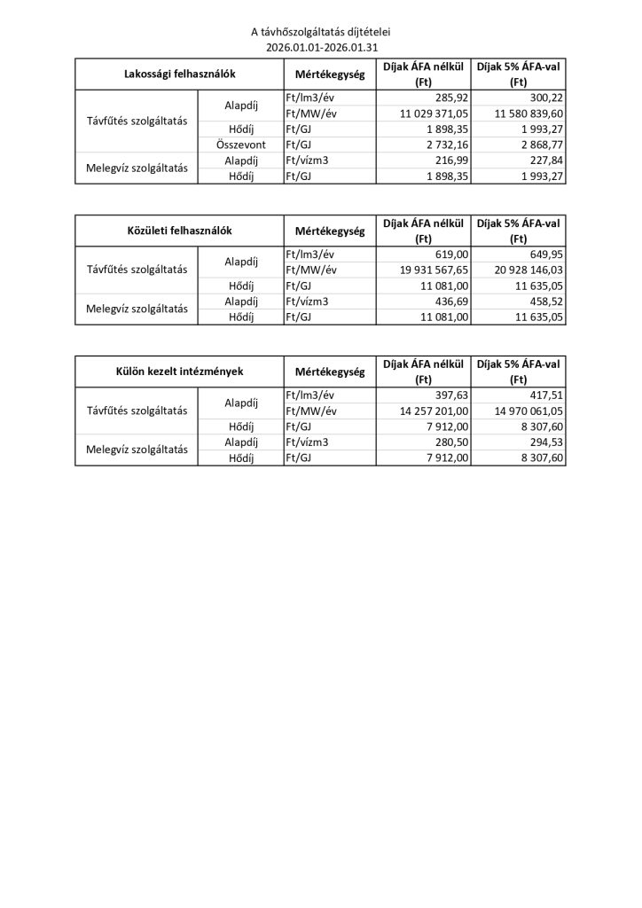 A távhőszolgáltatás díjtételei 2026.01.01-2026.01.31-ig